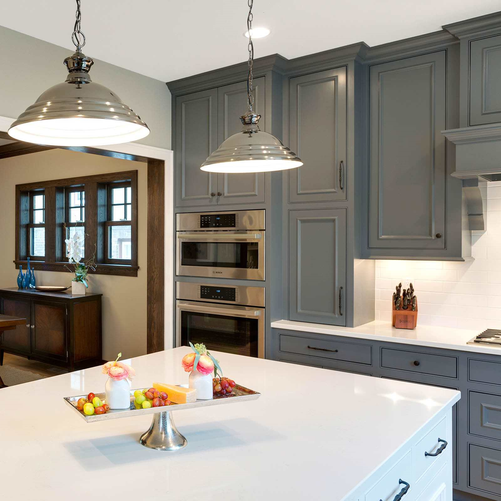 Cabinet type : Shaker style white base unit & wall unit with black wood grain island